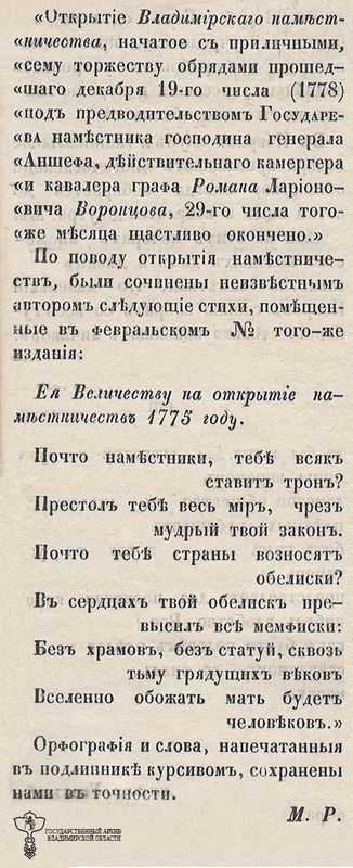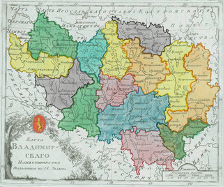 В первый период своего существования с 1778 по 1796 гг. Владимирская губерния одновременно имела статус наместничества, т.е. кроме губернатора (А.Б. Самойлов) в ней был еще и наместник (Р.И. Воронцов). Наместник - это чиновник, который обладал чрезвычайными полномочиями, имел право общего надзора за всеми органами управления и суда на той или иной территории и нес ответственность только перед императрицей. Обычно наместник надзирал сразу за несколькими губерниями. Так граф Роман Илларионович Воронцов был наместником одновременно Владимирской, Костромской, Тамбовской и Пензенской губерний. Как представитель императрицы наместник во время заседаний наместнического правления восседал на троне. Был такой трон и во Владимирской губернии. После смерти императрицы Екатерины II император Павел I упразднил институт наместничеств, а во Владимирской губернии были еще и ликвидированы уезды Киржачский, Александровский, Ковровский и Судогодский и их осталось 10. В 1803 г. при императоре Александре I по представлению владимирского губернатора Ивана Михайловича Долгорукова Александровский, Ковровский и Судогодский уезды были восстановлены и их стало 13. В таком составе Владимирская губерния существовала до Октябрьской революции 1917 г.