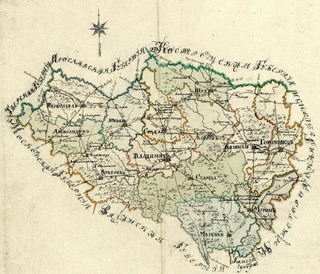 УЧРЕЖДЕНИЕ ВЛАДИМИРСКОЙ ГУБЕРНИИ 2 (13) марта 1778 г. вышел Указ «Об учреждении Владимирской губернии», который предписывал графу Роману Илларионовичу Воронцову объехать будущую Владимирскую губернию, составить примерное расписание ее на 13 уездов. По докладу Р.И. Воронцова 1 (12) сентября 1778 г. императрица Екатерина II издала новый указ, которым Владимирская губерния (в указе - наместничество) была создана в составе 14 уездов, центрами которых стали 7 старых городов (Владимир, Суздаль, Муром, Юрьев-Польский, Переславль-Залесский, Шуя и Гороховец) и 7 новых ранее не существовавших городов (Александров, Вязники - бывшие слободы; Киржач, Покров, Меленки, Судогда, Ковров - бывшие села). Общая площадь губернии составила около 49 тыс. квадратных километров. Первым Владимирским губернатором (правителем) был назначен Александр Борисович Самойлов, который занимал эту должность до 1787 года, граф Р.И. Воронцов - наместником в чине генерал-губернатора.