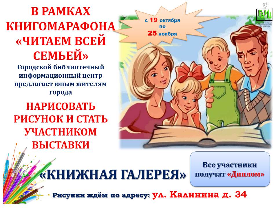 В рамках книгомарафона «Читаем всей семьей» Городской библиотечный информационный центр предлагает юным жителям НАРИСОВАТЬ РИСУНОК И СТАТЬ УЧАСТНИКОМ ВЫСТАВКИ семейного рисунка «КНИЖНАЯ ГАЛЕРЕЯ»