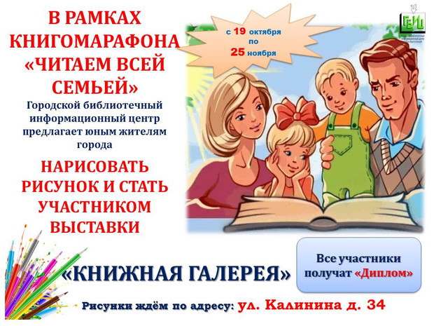 Крепкая семья – это ценность для каждого человека. Защита и забота, поддержка и уважение, любовь и взаимопонимание — основа крепких отношений в семье. Особая роль папы и мамы в формировании у детей веры в людей, во всё доброе, хорошее и честное, уверенности в себе и в завтрашнем дне. Праздники двух самых главных для любого человека людей – мамы и папы стоят в календаре рядом, 20 октября – День отца и 24 ноября – День матери. В рамках книгомарафона «Читаем всей семьей» Городской библиотечный информационный центр предлагает юным жителям НАРИСОВАТЬ РИСУНОК И СТАТЬ УЧАСТНИКОМ ВЫСТАВКИ семейного рисунка (акварель, карандаш и т.п.): «КНИЖНАЯ ГАЛЕРЕЯ» РАБОТЫ ПРИНИМАЮТСЯ с 19 октября по 25 ноября 2024 года ВЫСТАВКА БУДЕТ РАЗМЕЩЕНА В ФОЙЕ БИБЛИОТЕКИ