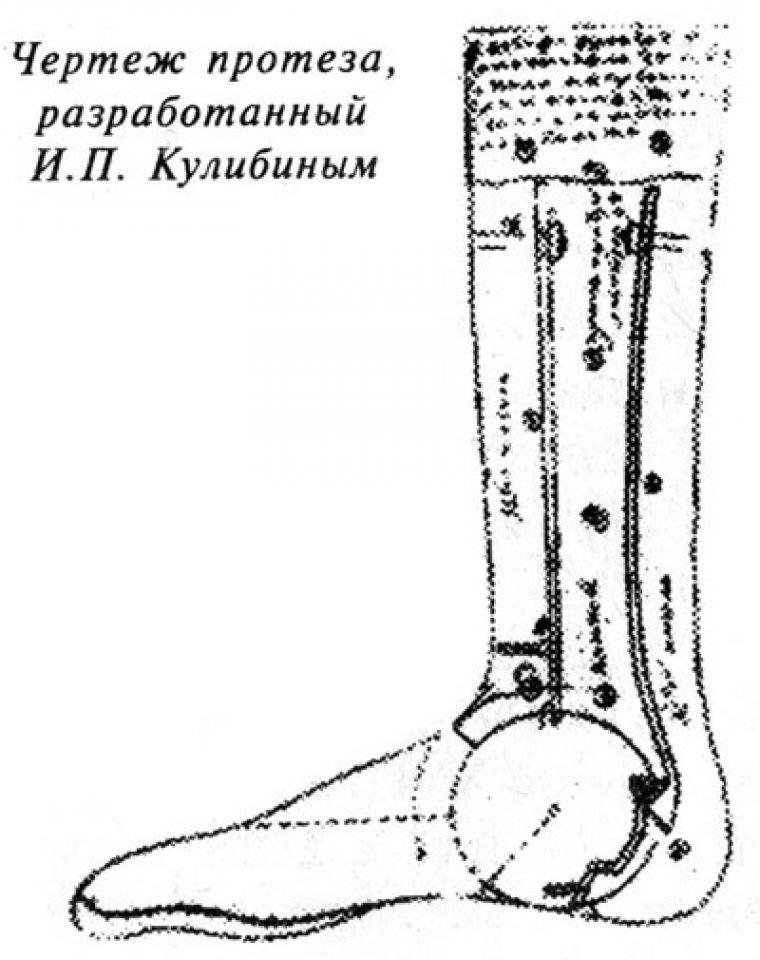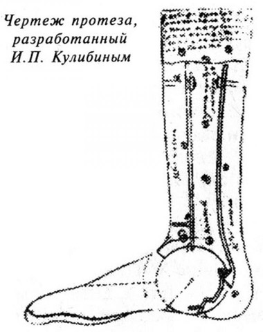 Сначала Кулибин пытался сконструировать четырехколесную «самокатку», однако для облегчения веса машины от одного колеса пришлось отказаться. В результате работы у Кулибина получился прототип современного велосипеда и легкового автомобиля. В конструкции механической "повозки-самокатки" он применил маховое колесо, тормоз, коробку скоростей, пружины и даже подшипники качения. В 1791 году проехался по улицам Петербурга на своей трехколесной повозке. Задние колеса повозки были большего диаметра, чем единственное переднее. Спереди рамы находилось сидение для двоих человек, за которым помещался стоя слуга. Он вставлял ноги в специальные «туфли», и, по очереди давя на них, запускал сложную систему рычагов, приводившую самокатку в движение. Модель «самокатки» не сохранилась, её удалось восстановить по оставшимся чертежам, и теперь в Государственном политехническом музее в Москве можно посмотреть как она работала. Конструкция "механической ноги" Иван Петрович Кулибин первый в мире разработал и стал делать механические руки и ноги для ампутированных частей тела. В 1791 году он разработал конструкцию «механических ног» — протезов. Такой протез Иван Петрович создал для героя Очаковского сражения, артиллерийского офицера С.В. Непейцына, потерявшего на поле боя ногу. Конечно, задолго до Кулибина предпринимались попытки создать удобный, качественный протез, но нашему изобретателю удалось создать нечто более совершенное по сравнению с предыдущими образцами. Механическая нога, как назвал её сам Кулибин, имела форму человеческой ноги. Протез был настолько хорош, что офицер Сергей Непейцын с этим протезом прошёл всю войну 1812 года, сражался в партизанских отрядах и потом брал Париж.. После войны 1812 года очень похожие механические протезы начали производить во Франции. Первый в мире лифт
