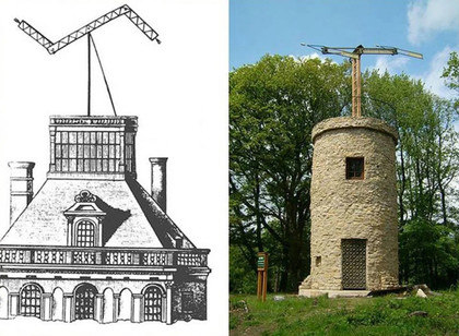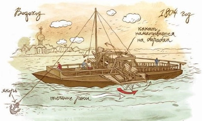 На сегодняшний день сохранились чертежи и остатки подъемного механизма. Водоход Идея конструкции заключалась в том, что водоход сам «подтягивал» себя вверх по течению, не требуя человеческих усилий. Расположенные на его бортах колеса крутились и передавали вращение нескольким осям, от которых движение передавалось барабану, наматывающему канат. Другой конец каната был привязан к якорю, брошенному выше по течению. Испытание второго варианта машины состоялось в Нижнем Новгороде только 22 года спустя в 1804 г. Водоход двигался очень медленно, со скоростью всего в одну версту в час, при этом за его движением постоянно должен был следить механик. В 1807 году появилась третья усовершенствованная версия судна, скорость которого должна была. Однако, хотя испытания доказали пригодность и экономичность этой разновидности судна, изобретение не было использовано. Оптический телеграф В 1794 году И. П. Кулибиным была изобретена и построена «дальнеизвещающая машина», представлявшая собой оптический семафор, в котором он, помимо зеркал, использовал изобретённый им фонарь с отражающим зеркалом. Это позволяло строить промежуточные станции на больших расстояниях и использовать телеграф и днём, и ночью даже в небольшой туман. Рама семафора Кулибиным была использована Т-образная, французская, но им был придуман остроумный приводной механизм, двигавший раму, и новый упрощенный код. Кулибинский код сводился в таблицу, с помощью которой ускорялись передача и расшифровка сигналов. Изобретение Кулибина произвело эффект, однако денег на постройку линии телеграфа в Академии наук «не нашлось». После демонстрации «дальнеизвещающая машина» Кулибина была сдана на хранение в Кунсткамеру. Имя Ивана Кулибина сохранилось в истории навсегда, хоть иногда и употребляется как нарицательное. «Кулибиными» называют сейчас самоучек, достигших определенного успеха в каком-либо виде ремесла. Кулибиными зовут тех, кто пытается своими силами преобразить какие-то машины и механизмы, усовершенствовать их