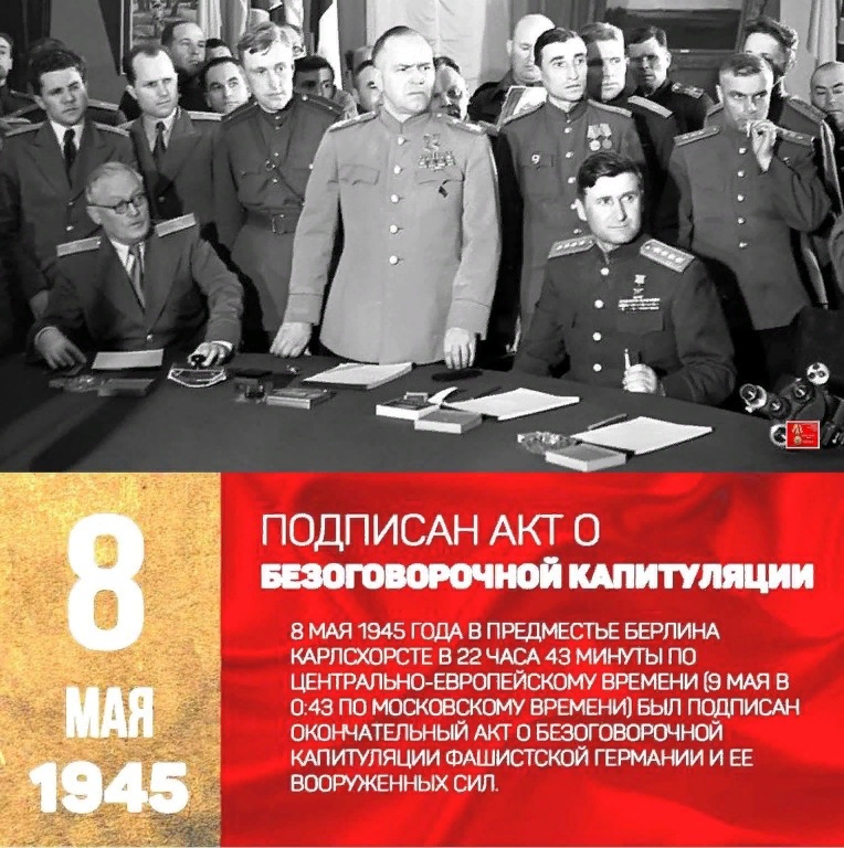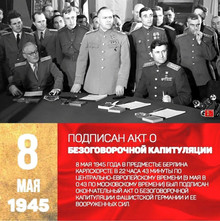 8 мая руководители США, Великобритании и Франции объявили о победе над Германией, а советское правительство не согласилось и потребовало подписания официального акта о безоговорочной капитуляции фашистской Германии, так как боевые действия на советско-германском фронте ещё продолжались: