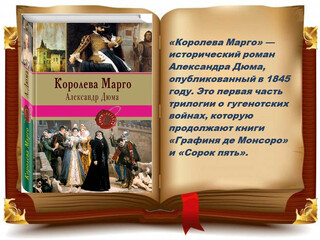 «Королева Марго» — исторический роман Александра Дюма, опубликованный в 1845 году. Это первая часть трилогии о гугенотских войнах, которую продолжают книги «Графиня де Монсоро» и «Сорок пять».