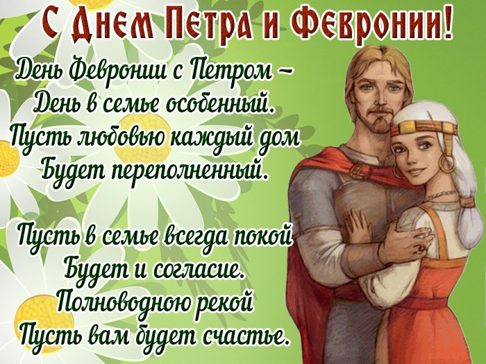 Традиции и символы праздника 8 июля принято проводить время с близкими: семьи собираются вместе. Символ праздника — ромашка. Её дарят в виде букета, одного цветка или венка. Ромашка означает чистоту, верность, надежду на любовь. В этот день поощряется помощь другим семьям и поддержка нуждающихся. Считается, что сны накануне могут быть вещими: одиноким они подсказывают будущего партнёра, а супругам — семейные перемены. По приметам жаркая погода в этот день сулит еще 40 дней зноя, а звёздное небо вечером — хороший урожай. Не рекомендуется ругаться, сплетничать и обманывать.