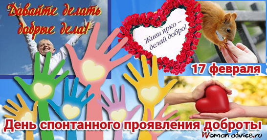 День спонтанного проявления доброты. Дата, о которой мало кто слышал, но повод и суть праздника очень важны. Этот праздник международный, зародился не в России. В нашей стране приняли утвержденную мировым сообществом дату. Торжество принято отмечать ежегодно, выбранная дата постоянна — 17 февраля. История праздника День спонтанного проявления доброты часто путают с другим праздником — Всемирным днем доброты. Последний придумали благотворительные организации на мировом съезде в 1998 году. Нередко в материалах, которые касаются истории праздника, смешивают два этих событиях. На самом деле День спонтанного проявления доброты появился немногим раньше в США. Существенную долю американской массовой культуры занимают выражение доброты, благотворительность и традиции меценатства. На рубеже 80-90-х годов газеты много рассказывали о спонтанных поступках добряков. Так родился постулат, который начали транслировать в массы — «Практикуйте спонтанные акты доброты и красоты» Девиз стали размещать на плашках автомобильных номеров, выпускать стикеры, помещать на почтовые ящики, а с развитием интернета запустили и в Сеть.. Но, собственно, без самих спонтанных актов доброты на одном пиаре праздник бы далеко не пошел. К счастью, девиз вдохновлял все больше людей на бескорыстные деяния: собрать мусор, нанести визит в дом престарелых, накормить бездомных, оплатить желающим автопарковку. Дела мелкие, войну и голод в мире такими делами не победить. Но сделать день счастливым даже для одного незнакомого человека — это важно. С развитием движения провозгласили, что День спонтанного проявления доброты будет отмечаться 17 февраля. Позже эту тенденцию подхватили в мире и в России. Традиции Чем хороши такие торжества, так это отсутствием строгого регламента и легкой ассимиляцией с местной культурой. Вспомните, какую неоднозначную реакцию вызывают у нас западные торжества вроде Дня всех влюбленных или Хэллоуина? Все дело в несовпадении культурного кода. Тогда как с Днем спонтанного проявления доброты в России все гораздо проще. Общечеловеческие ценности едины для всей современной цивилизации, поэтому праздник был благосклонно принят и у нас. К 2025 году сложились свои традиции этого праздника у локальных благотворительных организаций. В основном это волонтерские отряды, которые приглашают на один день примкнуть к их движению. Некоторые собирают вещи, устраивают благотворительные марафоны и мастер-классы. К сожалению, единого портала или организатора акции в России не появилось, поэтому узнать о проходящем мероприятии в большом городе непросто. Благо, это праздник не столько про организацию, сколько про личный вклад. Небольшое доброе дело по силам каждому. Как отметить День спонтанного проявления доброты «Сделать перевод в благотворительную организацию. Помните, что настоящий фонд зарегистрирован как юрлицо и имеет статус «НКО».
