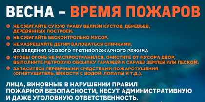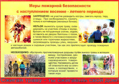 В весенне-летний период, который каждый человек в любом возрасте ждет с большой радостью и надеждой предстоящий отпуск, планирует проведение отдыха на природе в выходные и праздничные дни, а также провести определенную работу на своих приусадебных участках, дачах, в садовых домиках. К сожалению, некоторые забывают, что после таяния снега и ухода талой воды резко возрастает пожароопасная обстановка. Беспечное, неосторожное обращение с огнем при сжигании сухой травы, мусора на территории дач, садовых домиков зачастую оборачивается бедой – это почти 50% всех пожаров происходящих ежегодно именно по этой причине. Поэтому чтобы не случилось беды необходимо соблюдать правила пожарной безопасности: - не допускается разводить костры и выбрасывать не затушенный уголь и золу вблизи строений; - хранить легковоспламеняющиеся и горючие жидкости, а также горючие материалы, старую мебель, хозяйственные и другие вещи на чердаках; - производить электро и газосварочные работы без предварительной очистки места сварки от горючих материалов и без обеспечения места проведения огневых работ первичными средствами пожаротушения; - курить и пользоваться открытым огнем в сараях и на чердаках, а также в других местах, где хранятся горючие материалы. - оставлять без присмотра топящиеся печи, а также поручать надзор за ними малолетним детям; - применять для розжига печей бензин, керосин, дизельное топливо и др. Пожар – не стихия, а следствие беспечности людей!