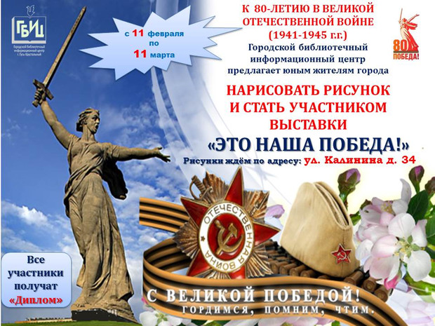 9 Мая 2025 года исполнится 80 лет с того момента, как закончилась Великая Отечественная война (1941–1945г.г), одна из самых страшных и разрушительных в истории человечества. Этот день стал символом подвига, мужества и стойкости советского народа, сумевшего выстоять в неимоверно трудных условиях и одержать Победу над фашизмом. Восьмидесятилетие Победы - это не просто юбилейная дата, это - напоминание о том, какой ценой было достигнуто наше сегодняшнее мирное существование. Советский Союз потерял более 27 миллионов своих граждан. Эти потери навсегда остались раной в сердцах миллионов людей, каждый шаг по освобождению своей родной земли был оплачен кровью. Война вынудила женщин и детей встать к станкам, работать в полях, строить окопы, работать в госпиталях. Каждый из них вносил свой посильный вклад в общую Победу, и без участия каждого из них она была бы невозможна. День Победы — это праздник, объединяющий поколения. Мы помним свою историю и гордимся ею! Городской библиотечный информационный центр предлагает юным жителям НАРИСОВАТЬ РИСУНОК И СТАТЬ УЧАСТНИКОМ ВЫСТАВКИ КО ДНЮ ВЕЛИКОЙ ПОБЕДЫ! «ЭТО НАША ПОБЕДА!» РАБОТЫ ПРИНИМАЮТСЯ с 11 февраля по 11 марта 2025 года ВЫСТАВКА БУДЕТ РАЗМЕЩЕНА В ФОЙЕ БИБЛИОТЕКИ