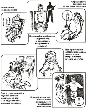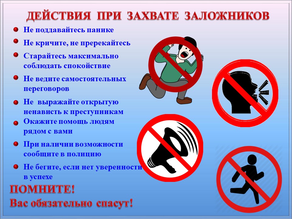За последние 10-20 лет практика захвата террористами и прочими преступными элементами невинных людей в качестве заложников стала распространенным «оружием террора». Во всех случаях человеческая жизнь становится предметом торга для террористов. Захват может произойти в транспорте, в учреждении, на улице, в квартире. Если вы оказались в заложниках у террористов - Сохранять спокойствие и не показывать страха. Не оказывать террористам сопротивления, не пытаться вступать с ними в беседу. Если Вас связали или закрыли глаза, попытайтесь расслабиться, дышите глубже. - Не делать резких движений. На всякое движение спрашивайте разрешение. - Выполнять требования террористов и не реагировать на их действия в отношении других заложников. - Не нарушать установленных террористами правил, чтобы не спровоцировать ухудшения условий содержания. - По возможности расположиться подальше от окон, дверей и самих террористов. Это необходимо для обеспечения безопасности в случае штурма помещения. - Не пытайтесь бежать, если нет полной уверенности в успехе побега. - При угрозе применения оружия лечь на живот, защищая голову руками. - При ранении меньше двигаться, чтобы уменьшить кровопотерю. - Постараться запомнить приметы террористов: их количество, степень вооружения, составить максимально полный словесный портрет, обратив внимание на характерные особенности внешности, телосложения, одежду, акцента и тематики разговоров, темперамента, манер поведения и др. Подробная информация поможет впоследствии в установлении личностей террористов. При длительном нахождении в положении заложника - Не допускайте возникновения чувства жалости, смятения и замешательства. Мысленно подготовьте себя к будущим испытаниям. Сохраняйте умственную активность. - Избегайте возникновения чувства отчаяния, используйте для этого внутренние ресурсы самоубеждения. - Думайте и вспоминайте о приятных вещах. Помните, что шансы на освобождение со временем возрастают. Будьте уверены, что сейчас делается все возможное для Вашего скорейшего освобождения. - Постоянно находите себе какое-либо занятие (физические упражнения, чтение, жизненные воспоминания и т.д.). Установите суточный график физической и интеллектуальной деятельности, выполняйте дела в строгом методическом порядке. - Для поддержания сил ешьте всё, что дают, даже если пища не нравится и не вызывает аппетита. Отдайте себе отчет в том, что потеря аппетита и веса являются нормальными явлением в подобной экстремальной ситуации. Если захватили самолет или автобус - Не привлекайте к себе внимание террористов. - Осмотрите внимательно салон и отметьте места возможного укрытия в случае стрельбы. - Снимите с себя ювелирные украшения. Женщинам в коротких юбках желательно прикрыть ноги. - Постарайтесь успокоиться - отвлекитесь от происходящего, если есть возможность, почитайте. - Не смотрите террористам в глаза. - Не передвигайтесь по салону и не открывайте сумки без их разрешения. - Не реагируйте на их провокационное или вызывающее поведение. - При попытке штурма ложитесь на пол между креслами и оставайтесь там до его окончания. - После освобождения немедленно покиньте самолет или автобус. При перестрелке на улице - Если вы оказались в это время на улице, сразу же ложитесь на землю и осмотритесь. - Выберите ближайшее укрытие и п