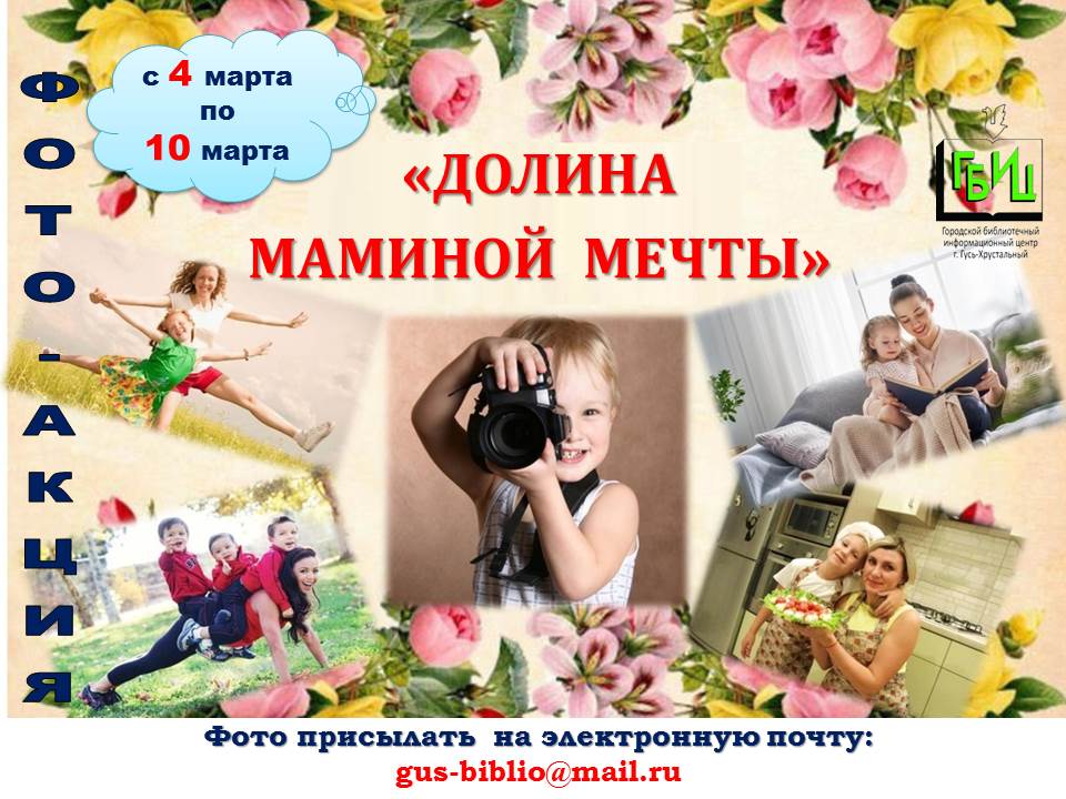 8 марта — Международный женский день. Праздник Весны, Любви и Красоты! В этот день мы восхищаемся красотой и неповторимостью мам и бабушек. Говорим им теплые, приятные слова, дарим цветы и подарки. Этот праздник наполнен теплом и любовью. Городской библиотечный информационный центр ПРИГЛАШАЕТ ПОУЧАСТВОВАТЬ В ФОТО-АКЦИИ «ДОЛИНА МАМИНОЙ МЕЧТЫ» Это место окружено тайной. Ведь так не просто бывает понять, о чём мечтает мама или бабушка. Для участия в Акции необходимо НА ФОТОГРАФИИ продемонстрировать таланты Вашей мамы или бабушки: спортивные, музыкальные, литературные, кулинарные, танцевальные. Помощь членов семьи приветствуется. Проявите креатив и фантазию! РАБОТЫ ПРИНИМАЮТСЯ с 4 по 10 марта 2025 года