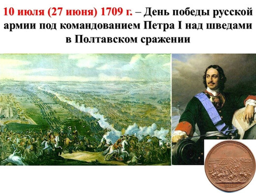 10 июля День победы русской армии над шведами в Полтавском сражении 1709 г. 8 июля 1709 года произошло генеральное сражение Северной войны 1700-1721 годов — Полтавская битва. Русская армия под командованием Петра I разгромила шведскую армию Карла XII. Полтавское сражение привело к перелому в Северной войне в пользу России. В честь этой победы установлен День воинской славы России, который отмечается 10 июля. Северную войну Россия вела со Швецией за выход к Балтийскому морю. В 1700 году молодая и неопытная армия Петра I была разбита под Нарвой, недалеко от Балтийского моря, полководцем, молодым шведским королем Карлом ХII. После поражения русской армии Петр I в 1700-1702 годах осуществил грандиозную военную реформу — фактически заново создал армию и Балтийский флот. Весной 1703 года в устье Невы Петр I основал город и крепость Санкт-Петербург, а позже — морскую цитадель Кронштадт. Летом 1704 года русские захватили Дерпт (Тарту) и Нарву и таким образом закрепились на побережье Финского залива. В то время Петр I был готов заключить мирный договор со Швецией. Но Карл ХII решил продолжать войну до полной победы, чтобы полностью отрезать Россию от морских торговых путей. Весной 1709 года после неудачной зимней кампании на Украине войско шведского короля Карла ХII осадило Полтаву, в которой предполагалось пополнить запасы, а затем продолжить путь в направлении Харькова, Белгорода и далее на Москву. В апреле‑июне 1709 года гарнизон Полтавы в составе 4,2 тысячи солдат и 2,6 тысячи вооруженных горожан во главе с комендантом полковником Алексеем Келиным, поддержанный подошедшей на подмогу конницей генерала Александра Меншикова и украинских казаков, успешно отбил несколько штурмов противника. Героическая оборона Полтавы сковала силы Карла ХII. Благодаря ей Русская армия получила возможность в конце мая 1709 года сосредоточиться в районе крепости и подготовиться к битве с врагом. В конце мая в район Полтавы подошли главные силы русской армии под командованием Петра I. На военном совете 27 июня было решено дать генеральное сражение. К 6 июля русская армия, численностью в 42 тысячи человек и имевшая 72 орудия, расположилась в созданном ею укрепленном лагере в 5 километрах севернее Полтавы. Поле перед лагерем шириной около 2,5 километра, прикрытое с флангов густым лесом и зарослями, было укреплено системой полевых инженерных сооружений из шести фронтальных и четырех перпендикулярных им четырехугольных редутов. Редуты находились друг от друга на расстоянии ружейного выстрела, чем обеспечивалось тактическое взаимодействие между ними. В редутах разместились два батальона солдат и гренадеров, за редутами — 17 кавалерийских полков под командованием Александра Меншикова. Замысел Петра I заключался в том, чтобы измотать противника на передовой позиции (линии редутов), а затем разбить его в открытом полевом бою. В ночь на 8 июля шведское войско под командованием фельдмаршала Карла Реншильда, численностью около 20 тысяч солдат и с четырьмя орудиями — четырьмя колоннами пехоты и шестью колоннами конницы — двинулось к позиции русских. Остальные войска — до 10 тысяч солдат находились в резерве и на охране шведских коммуникаций. Могучий патриотический настрой вызвали у русских воинов обращенные к ним перед началом сражения слова Петра: "Воины! Пришел час, который должен решить судьб