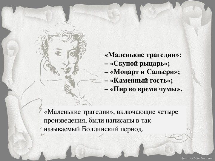 195 лет со времени написания цикла «Маленькие трагедии» А.С. Пушкин (1830). «Маленькие трагедии» А.С. Пушкин назвал, или драматическими сценами, или маленькими трагедиями. Это уникальные произведения, вызывающие неоднозначные чувства у читателей, критиков и исследователей творчества великого поэта, состоят из четырех камерных драм - «Скупой рыцарь», «Моцарт и Сальери», «Пир во время чумы», «Каменный гость». Каждый со своей сюжетной линией, главными героями, с ярко выраженными в их характере, страстями человеческими. В «Скупом рыцаре» - жадность и скупость, в «Моцарте и Сальери» - восхищение и зависть, «гений и злодейство», «Каменный гость» - это любовь и страдание. Но в драме «Пир во время чумы» не отражено какое-либо отрицательное пристрастие человека, а собраны воедино, описанные страсти. Поэт выдает некое заключение о сущности жизни, бытия и смерти. Все ли равны перед смертью?! Перед лицом смерти, эпидемией чумы, нет социальных границ, нет избранных. Герои пьес Пушкина проживают кульминационный момент сюжета, «маленькую трагедию» в течение короткого времени. В произведениях противостоят друг другу два персонажа, являющиеся антиподами (скупой Рыцарь и щедрый Герцог; Моцарт и Сальери, Пир и Чума, Дон Гуан и Командор). Противостояние героев, выплеск эмоций и трагическая кульминация-развязка, говорят о целостности пьес. По жанровому описанию – это трагедии. Возможно, что в их написании Пушкин вдохновлялся европейской культурой и литературой. В литературе Европы ранее уже освещались темы, которые были затронуты в «Маленьких трагедиях». Эпоха Средневековья находит отражение в драме «Скупой рыцарь». Пушкин ссылается в заглавии: «Сцена из Ченстоновой трагикомедии: The Covetous Knight», хотя у английского поэта 18 века, Уильяма Шенстона, не было такого произведения. Век Просвещения, век свободомыслия, развития науки и философии, духовного и интеллектуального совершенствования, находит отражение в размышлениях-монологах Сальери. Сомнения и восхищение, зависть и восторг приплетены в эту историю. Роль Сальери в развитии творчества Моцарта огромна, но Пушкин для пущей контрастности поддержал легенду, ходившую по Европе, что Сальери отравил великого гения. Пушкинскую пьесу «Пир во время чумы» можно назвать вольным переводом произведения британского поэта, эссеиста, Джона Вильсона, чья романтическая поэма «Город Чумы» была напечатана в сборнике автора в 1816 году. В трагедии Пушкина и в поэме Вильсона описываются события, произошедшие во время эпидемии чумы в Лондоне, в 1665 году. Герои эпохи романтизма полны воодушевления, самопожертвования и страсти. Образ Дон Хуана появился в литературе эпохи Возрождения. Многие драматурги использовали образ этого ловеласа-авантюриста в своих творениях. Пушкин впервые вписал в трагедию образ «вечного» героя комедий. Получился Дон Гуан у Пушкина, сложной и внезапной личностью, легко и коварно играющий на чувствах людей. Умеющий их уговорить, соблазнить или подвести к решительным шагам, но в то же время, бесстрашный и мужественный. В каждой трагедии Пушкин показывает личность героя с разных сторон, легко употребляя нужные слова в нужный момент, что дает получить полное описание времени и места драмы. Яркие личности, живые люди, реальная жизнь, разные эпохи, но страсти и жизненные вопросы, проблемы характера оста