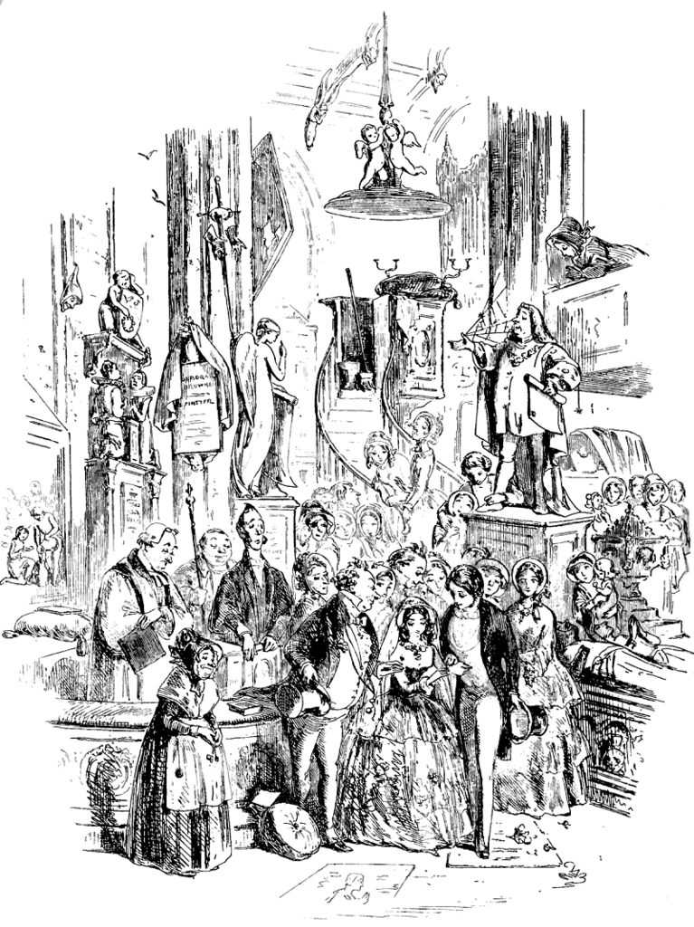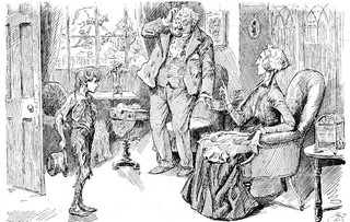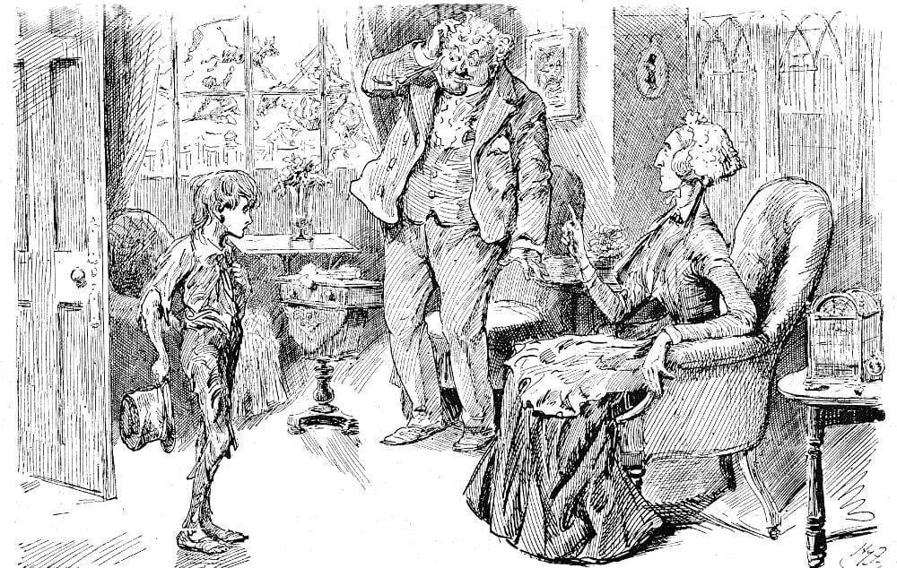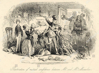 Родители писателя Все же мать и отец Диккенса появляются в романе, правда, в качестве других персонажей. Они выведены под именами мистера и миссис Микобер. Это хозяева квартиры, в которой поселились главные герои, когда приехали в Лондон. Миссис Микобер представлена элегантной благородной женщиной, которая все время вспоминала о своей роскошной девичьей жизни. Ее семья была недовольна выбором дочери, так как мистер Микобер вел разгульную жизнь, сорил деньгами и в итоге обанкротил семейство. Микоберы попали в долговую тюрьму и какое-то время жили там. Это была обычная практика в XIX в. Семья Диккенсов тоже за долги однажды попала в тюрьму. Собственно, поэтому маленький Чарльз и работал на фабрике. Так что история супругов Микобер во многом списана с родителей писателя. Однако, несмотря на все невзгоды, Микоберы жили счастливо и преодолели свои неприятности. Возможно, в жизни у родителей писателя тоже был счастливый брак. Даже несмотря на непростые отношения с сыном. Своих родителей Диккенс показал в романе в образах супругов Микоберов. Иллюстрация Хаблота Брауна (Физа), 1850 год