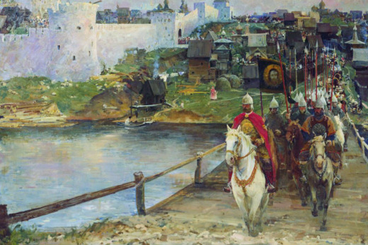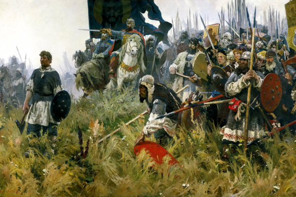 1360–1370-ые годы русские княжества были не так сильны и организованны. Слабела из-за междоусобиц и Золотая Орда. Поэтому противостояния между Золотой Ордой и русскими землями шли с переменным успехом. В одних сражениях победу одерживали русские князья, в других — войска Золотой Орды. Причины Куликовской битвы В 1374 году московский князь Дмитрий Иванович после очередной успешной битвы отказался платить дань Золотой Орде. Золотая Орда решила проучить русского князя и двинула одного из своих полководцев на русские земли. Битва произошла на реке Вожже в 1378 году и завершилась победой русских войск. Событие сильно разозлило Мамая — правителя части Золотой Орды. Ордынский воевода стал готовиться к масштабной войне. Войско Мамая Военные подготовки шли два года. За это время Мамай смог собрать огромное по тем временам войско численностью в 150 000 солдат. На стороне монголов также выступали литовский князь Ягайло и не веривший в победу Дмитрия рязанский князь Олег. Войско Дмитрия Войско московского князя Дмитрия тоже не было маленьким. Сто тысяч воинов собрались из всех русских княжеств. Также на сторону Дмитрия перешли полки литовских князей Андрея и Дмитрия — братьев Ягайло. Е.И. Данилевский «К полю Куликову» (1980 год)