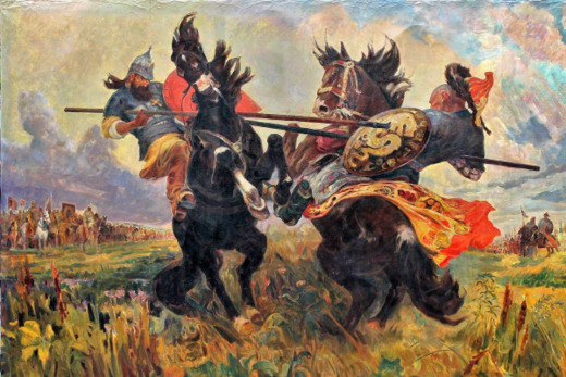 Даты Куликовской битвы Объединённые русские войска и орда встретились 8 сентября 1380 года между Доном и его притоком Непрявдой на Куликовом поле. Битва богатырей По традиции бой начался с поединка двух богатырей. Со стороны Золотой Орды выступил Челубей, с русской — Пересвет — монах Троице-Сергиева монастыря. Всадники ударили друг друга копьями. Челубей свалился с седла и умер. А Пересвет, несмотря на полученные раны, смог вернуться к своему войску и испустить дух на руках у своих, что сочли за хороший знак перед битвой. Бой начался с натиска ордынской конницы. Русские войска отступили к Непрядве. Мамай наблюдал за произошедшим и ждал долгожданной победы. Но Дмитрий оставил в засаде дополнительный полк, который в нужный момент нанёс решающий удар. Русские войска захватили лагерь ордынцев и преследовали врага более 30 км. Мамай смог бежать. М.И. Авилов «Поединок Пересвета с Челубеем на Куликовом поле» (1943 год)