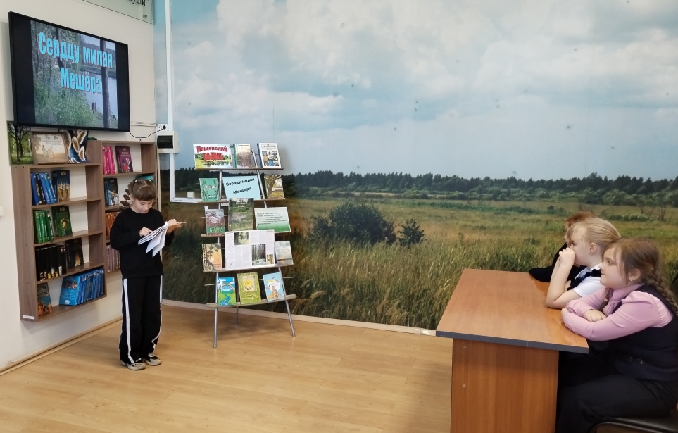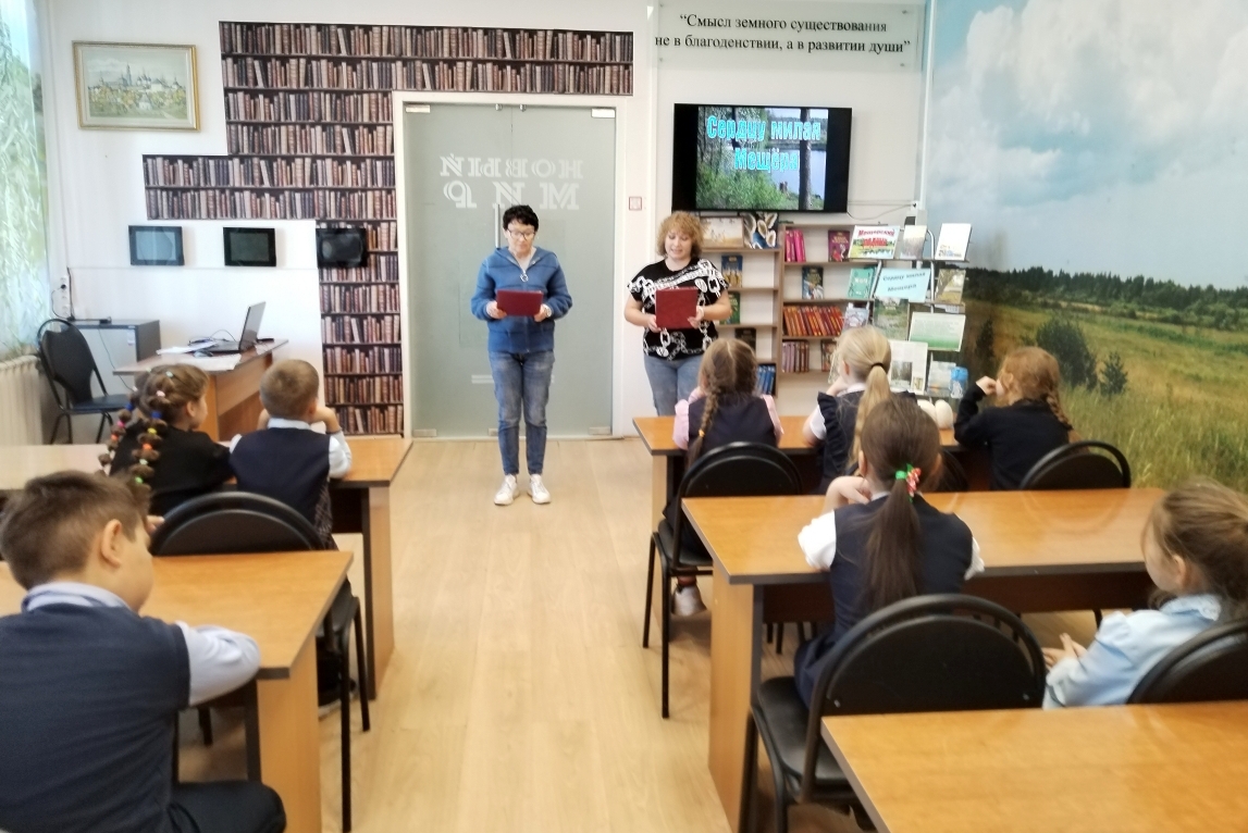 Каждому человеку бесконечна дорога его малая Родина. Наша малая Родина – Мещерская земля. Для учащихся 2 класса школы №7 сотрудники детской библиотеки МБУК «ЦБС г. Гусь-Хрустальный» подготовили литературно-краеведческую программу «Чудесный край - Мещера». Воображаемое путешествие состоялось 16 сентября. Ведущие предложили школьникам пройти заповедными тропами Мещеры, пристально всмотревшись в ее природную красоту, отображенную в прозе и поэзии местных литераторов. В качестве прекрасного дополнения демонстрировались слайды: мещёрские пейзажи и представители флоры и фауны нашего края. Ученики, разгадывая загадки о растениях и животных нашего края, проявили отличные знания природного мира. С большой любовью изображали на полотнах пейзажи Мещеры великие русские художники. Эти работы были представлены в слайд-презентации «Мещера в живописи». Завершая программу, организаторы призывали школьников, обращаясь к книжным изданиям, расширять свои познания Мещерского края, учиться внимательному и бережному отношению к живому миру природы. Быть настоящими знатоками и патриотами своей малой Родины.
