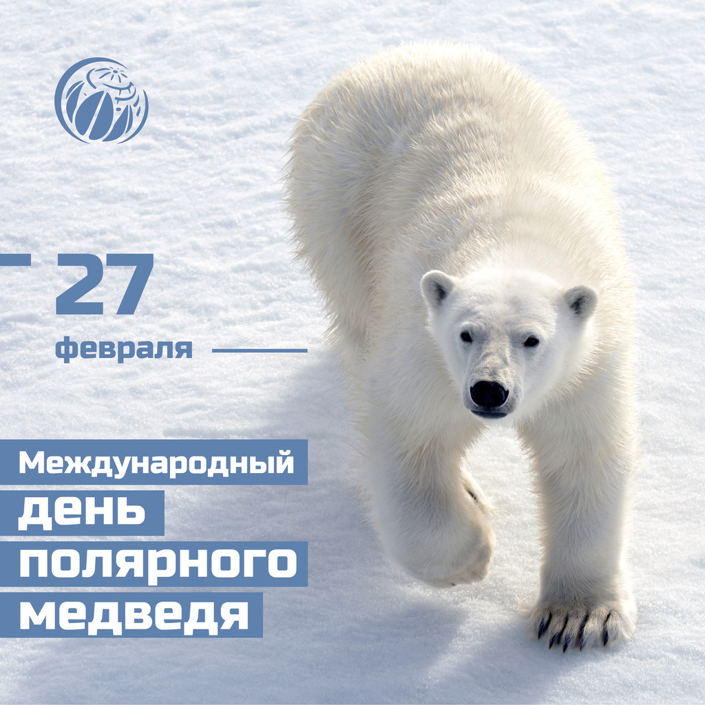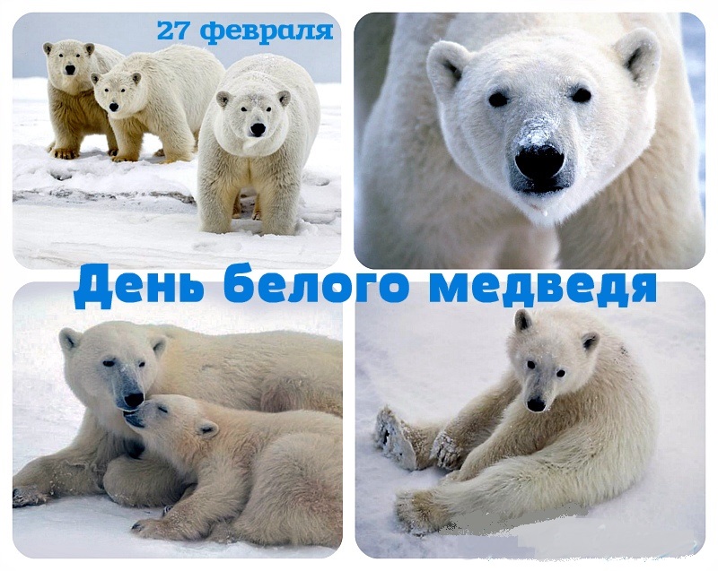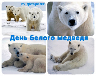 27 февраля отмечается Международный день полярного медведя. Живет медведь среди льдов и вод Арктики, его можно встретить даже почти у самого Северного полюса. Больше всего этих красивых животных живет в нашей стране на побережье и в водах северных морей Чукотского, Баренцева и Карского. Праздник учреждён, чтобы привлечь внимание к защите этого удивительного животного, которого называют королём арктических пустынь и вечных льдов Северного Ледовитого океана. Белый медведь – самый опасный и крупный хищник Арктики. Он очень быстро бегает и отлично плавает, имеет острый слух и прекрасный нюх. К сожалению, белый медведь занесён в Международную Красную книгу и в Красную книгу России. В последнее время дому белых медведей угрожает опасность: арктические льды с каждым годом тают все больше, а мест для строительства берлог и добычи пищи становится все меньше. Опасность исходит и от самого человека: браконьерство, загрязнение вод Арктики и побережья северных морей. На сегодня их осталось около 22-31 тысячи особей. Охота на них строго контролируется, ведутся наблюдения за их жизнью, и придумываются новые способы как им помочь. Где живут белые медведи? Белого медведя называют царем Арктики, широты его обитания от северного побережья материков (зона арктических пустынь) до 88 градуса на север (это почти Северный полюс). Полярный медведь - самый крупный наземный хищник. Всего в пяти странах можно встретить этих белоснежных великанов: Россия, США, Канада, Норвегия и Дания (остров Гренландия). Белые медведи выбирают укромные уголки для берлог, их места обитания обычно не пересекаются с поселениями людей. Но иногда все-таки человек встречает медведей. Людям стоит остерегаться таких встреч, вдруг медведь окажется голодным, а он всё-таки хищник. В нашей стране больше всего берлог белых мишек, особенно на северных островах: Новая Земля, остров Врангеля и Земля Франца Иосифа. Действительно ли медведи белого цвета? Удивительно, но нет. Шерсть белого медведя в действительности прозрачная и отражает окружающий их свет. Шерстинки словно трубочки, наполненные воздухом, они помогают сохранять тепло. Иногда шерсть медведя может показаться желтоватой (она становится такой с возрастом или от грязи) или зеленоватой (это видны на мишке застрявшие в мехе водоросли, они радостно развиваются, попав в теплые влажные условия). Но еще более занимательно, что кожа медведей - черная, она помогает мишкам удерживать тепло. А язык темный, иногда даже темно-синего цвета. Медведи очень любят свой белоснежный мех и хорошо заботятся о нем: после еды они тратят до получаса времени, чтобы умыться и привести себя в порядок. Как еще называют белых мишек? Нанук, ошкуй, умка - так называют белых медведей народы севера. Латинское название Ursus maritimus переводится как «медведь морской», и это неслучайно. Ведь полярный медведь большую часть своей жизни проводит в воде, а на лапах между пальцами у него есть перепонки. Медведи очень выносливые и хорошо тренированные пловцы, ведь им нужно проплывать от одних льдов до других на большие расстояния в поисках пищи и места для отдыха. Плавают они со скоростью 6,5 километров в час. Какой образ жизни у белых медведей? Снежные гиганты по своей сути кочевники. На протяжении всей своей жизни они плавают от дрейфующих (плавающих в морях и океане) к припайны