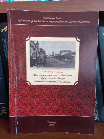 В 2016 г. Владимирская областная научная библиотека начала реализацию издательского проекта «Вспоминая былое…», основная цель которого не только сохранить наследие владимирских краеведов, но и сделать его доступным для широкого круга читателей. Рукописные материалы хранятся в единственном экземпляре в фонде библиотеки. Работа с такими документами осложняется тем, что физическое состояние рукописей не позволяет читателям часто обращаться к оригиналу. Поэтому и было принято решение о переиздании рукописей и особо ценных изданий. Сегодня представляем книгу, изданную по воспоминаниям владимирского краеведа «М.В.Косаткин. Мои гимназические годы во Владимире. Прогулки по Владимиру. Библиотека и театр во Владимире.»: Косаткин, Михаил Васильевич (1892-1980). Мои гимназические годы во Владимире ; Прогулки по Владимиру ; Библиотека и театр во Владимире / М.В. Косаткин ; [отв. ред. И. В. Мишина, А. А. Тихомирова] О книге: В книге собраны воспоминания Михаила Васильевича Косаткина о жизни в губернском городе Владимире в конце XIX – начале XX века, несомненно, представляют большой интерес не только для историков, исследователей, краеведов, но и для всех, кто интересуется историей города Владимира. Книга содержит три части: «Мои гимназические годы во Владимире (в 2-х частях)», «Прогулки по Владимиру», «Библиотека и театр во Владимире». Издание проиллюстрировано фотографиями из рукописей М.В.Касаткина, открытками с видами г. Владимира в начале прошлого столетия.
