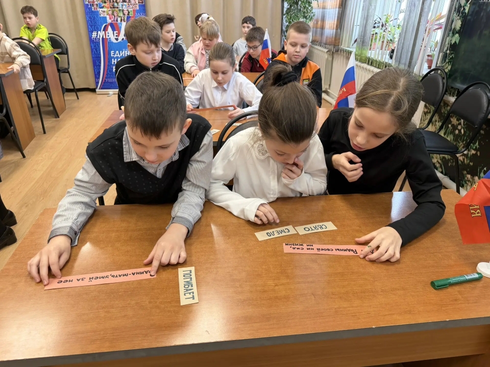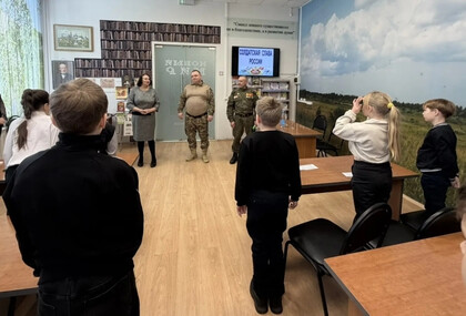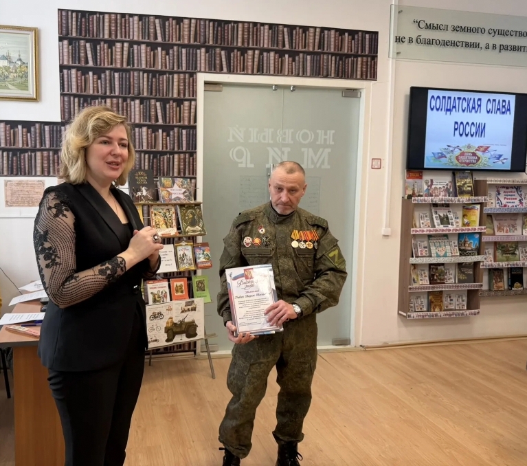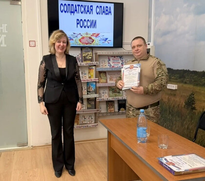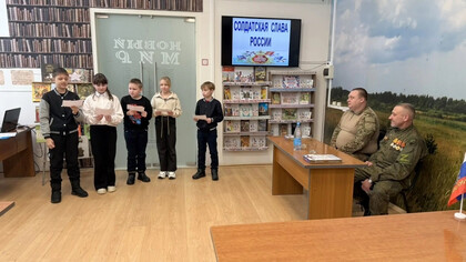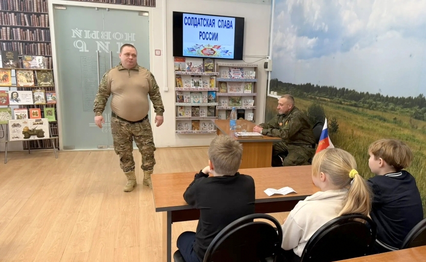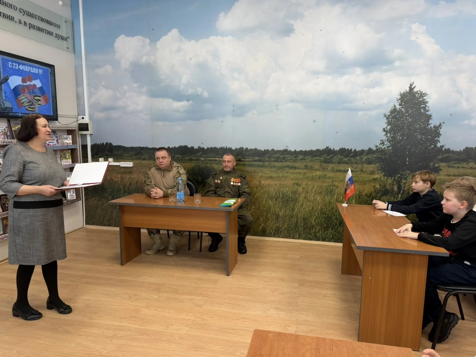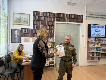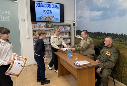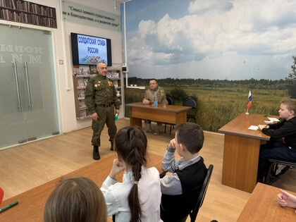 В преддверии праздничной даты - Дня защитника Отечества - 20 февраля в Детской библиотеке был организован патриотический урок «Солдатская слава России» для учащихся 3 класса школы №7. Школьникам рассказали об истории русской армии, начиная с самых давних времен. Воинские традиции и качества солдатского характера нашли своё отражение в русских пословицах. Ребятам предложили конкурс «Узнай пословицу». Школьники успешно справились с заданием. Солдатские отвага и смекалка прославлены во многих сказках, ведущие предложили отгадать загадки «Сказки из солдатского вещмешка». Узнали ребята и об оснащении современной российской армии, отвечая на вопросы викторины «Боевая техника России». Почетными гостями мероприятия были сержант в отставке Рыбин В.Е. – ветеран боевых действий на Северном Кавказе и СВО и гвардии рядовой Белов П.П. – ветеран СВО. Своими воспоминаниями о важном в их жизни времени земляки поделились со школьниками, а также высказали слова напутствия будущим защитникам Отечества. Множество стихотворений и песен создано поэтами и композиторами в честь наших воинов. Несколько выразительных сочинений вошло в программу мероприятия. Ведущие предложили школьникам назвать качества, которыми должны обладать современные защитники Отечества. И ребята рассказали, какими качествами характера должны обладать воины нашего времени, стоящие на страже мира и благополучия Родины Героям-землякам ребята прочитали патриотические стихотворения и вручили поздравительные адреса с теплыми, добрыми пожеланиями. В завершение ребята и почетные гости сделали совместную фотографию на память.
