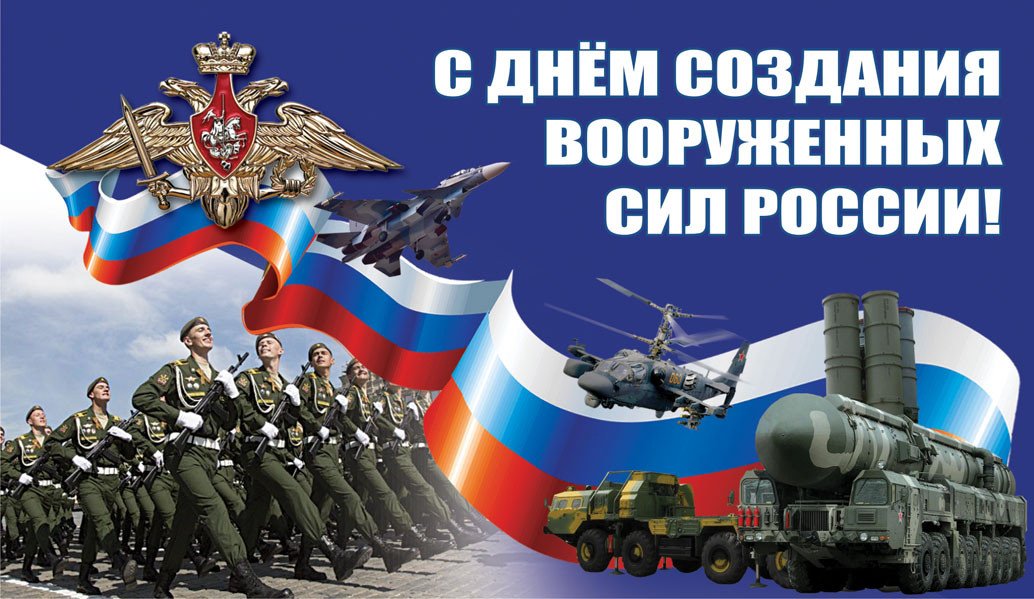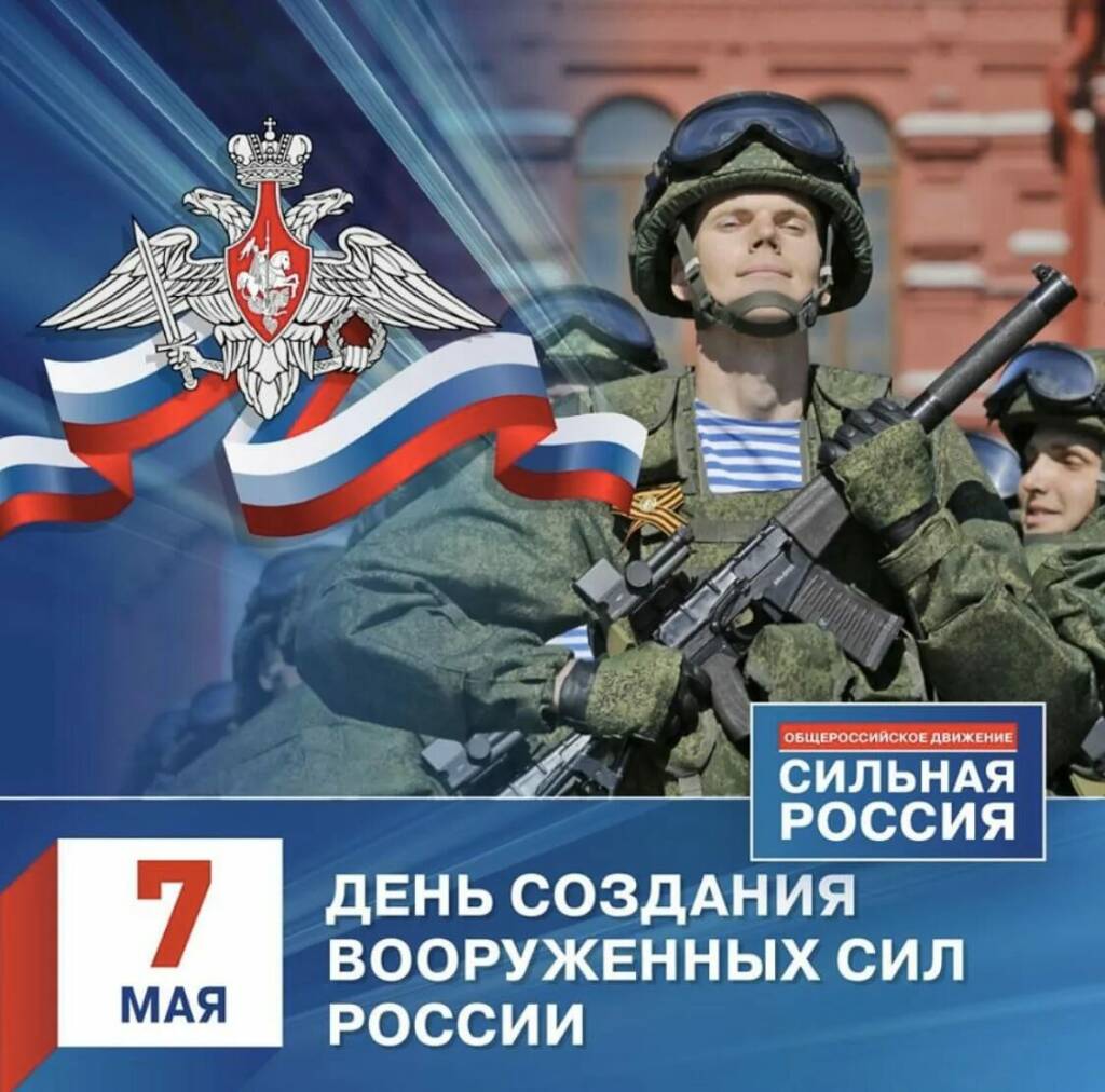 7 мая в России отмечается день создания Вооруженных Сил. Вооруженные Силы Российской Федерации (ВС) – мощная военная организация мира, способная противостоять любым внешним и внутренним агрессивным силам и готовая в любую минуту стать на защиту своей страны и народа. Несмотря на кажущуюся молодость, Вооруженные силы России имеют древние корни, уникальную историю, освещенную великими победами и горькими поражениями. За свою историю армия не единожды реформировалась, да и называлась по-разному. Но суть русской армии не менялась никогда - она всегда стояла на страже родных рубежей и была готова отразить агрессию любого врага. История праздника. История Вооруженных Сил развивалась в рамках становления Российского государства. Немало важных событий связано с доблестью и отвагой русских воинов, которые подчас ценой жизни отстаивали свободу своего народа и нерушимость границ Родины. В славные страницы истории вписаны победы на Куликовом поле, под Полтавой, в Бородинском сражении и в Великой Отечественной войне. Статус постоянной военной единицы ВС России получили в годы правления Ивана Грозного. Это было организованное войско, имеющее централизованное управление, систему снабжения и обслуживания. Петр I внес коренные изменения в организацию регулярной армии, четко структурировав состав и уводящую иерархию. В XIV веке в результате военной реформы была введена обязательная воинская повинность вне зависимости от сословий. Это позволило укрепить обороноспособность страны, придать ей мощь и силу. В результате регулярного обучения и подготовки военных кадров воинская обязанность для некоторых служащих стала профессией. Большое внимание в конце века было уделено техническому перевооружению действующей армии. После свершения Октябрьской революции армия несколько раз была переименована. Но суть ее не менялась. Примером беззаветной верности Отчизне и храбрости стали суровые страницы истории Вооруженных Сил в войну 1941-1945 годов. Благодаря непомерным усилиям советских солдат была предотвращена оккупация фашистской Германией не только территории России, но и других государств. Память о героизме миллионов людей – священный долг потомков всех поколений. О Вооруженных Силах РФ Вооруженные Силы Российской Федерации были созданы в 1992 году распоряжением главы государства. Они составляют основу обороны страны и действуют под руководством Верховного главнокомандующего РФ - президента России. В армии занято более 800 тысяч человек. Ключевой обязанностью ВС является готовность отразить агрессии, направленные против государства и покушения на целостность и неприкосновенность его территорий. Военная организация имеет развитую структуру, которая объединена органом центрального управления. Основные виды ВС РФ: Сухопутные войска (СВ); Военно-воздушные силы (ВВС); Военно-Морской флот (ВМФ); отдельные роды войск (воздушно-космической обороны (ВВКО), воздушно-десантные (ВДВ) и ракетные стратегического назначения (РВСН). В составе ВС Российской Федерации, кроме воинских соединений и подразделений, имеются учебные учреждения по подготовке профессиональных специалистов военного дела. Входят сюда и организации, выполняющие дополнительные функции по укреплению обороноспособности страны и обслуживанию воинских подразделений. Вооруженн