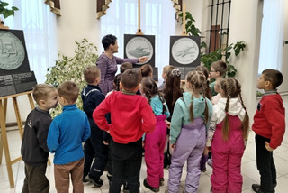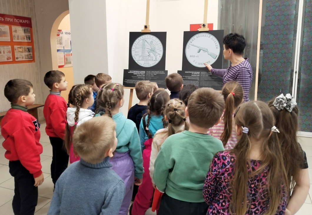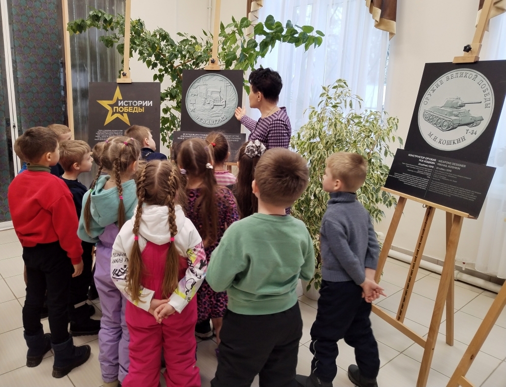 Экспозиция «Истории Победы» ЦБ России продолжает свою работу в библиотеке. 6 февраля выставку посетили воспитанники детского сада №3 (корпус №1). Для дошкольников была проведена экскурсия. На фотополотнах размещены увеличенные изображения памятных монет, посвященных подвигу советского народа в годы Великой Отечественной войны (1941-1945 г.г.). Ребята рассматривали выставочные экспонаты и с интересом слушали рассказ сотрудника библиотеки о ключевых событиях войны: сражение на Курской дуге, освобождение Севастополя, битва за Москву. Рассматривали фрагменты известных фронтовых снимков, памятники и мемориалы героям войны, боевую технику военного времени. Часть монет на выставке посвящена легендарным советским конструкторам: создателю пикирующего бомбардировщика Пе-2 Владимиру Петлякову, пистолета-пулемета ППШ Георгию Шпагину, конструктору легендарного танка Т-34 Михаилу Кошкину. | |